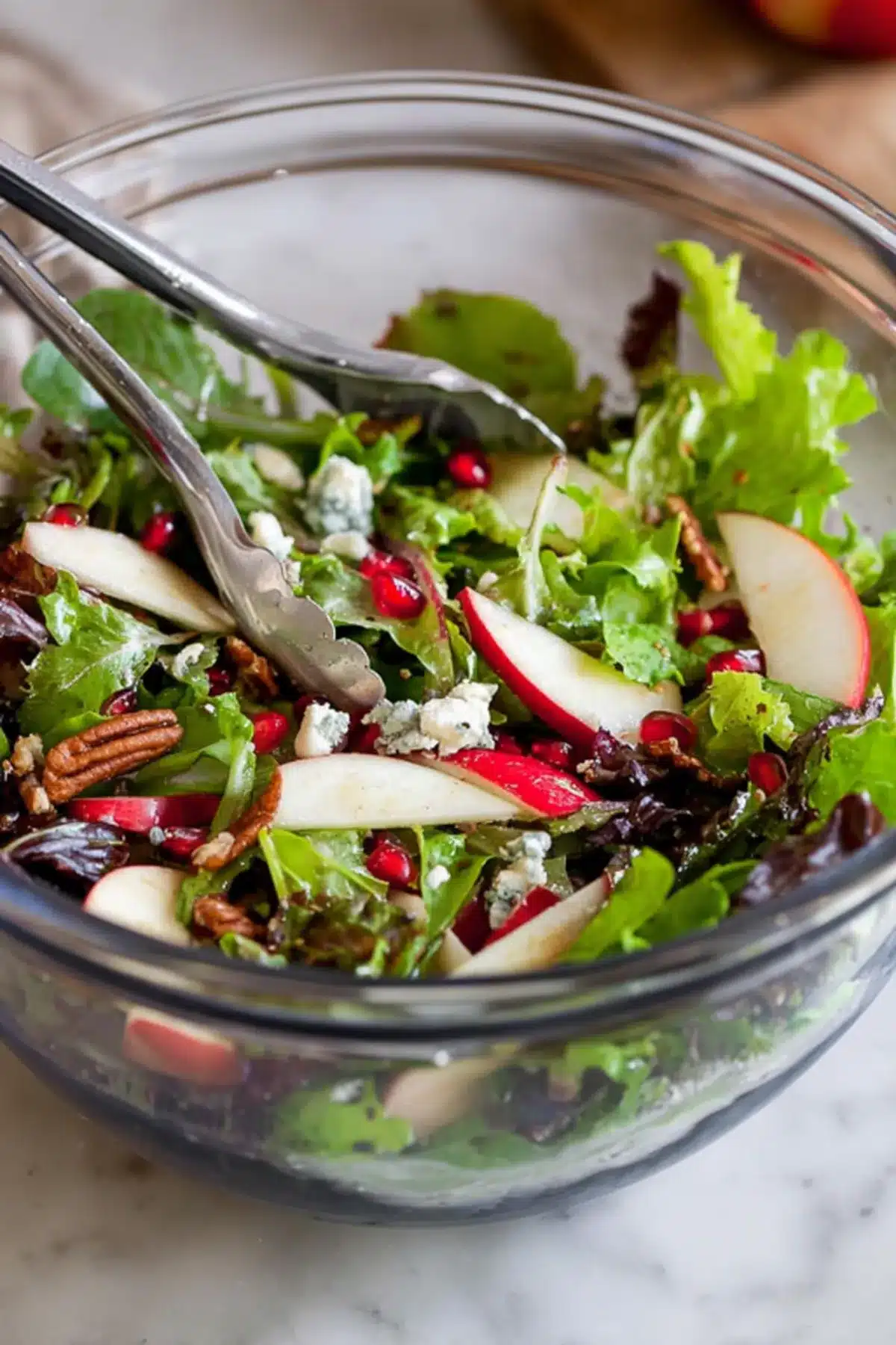 - Place greens, apples, pomegranate seeds, blue cheese, and pecans in a large bowl.